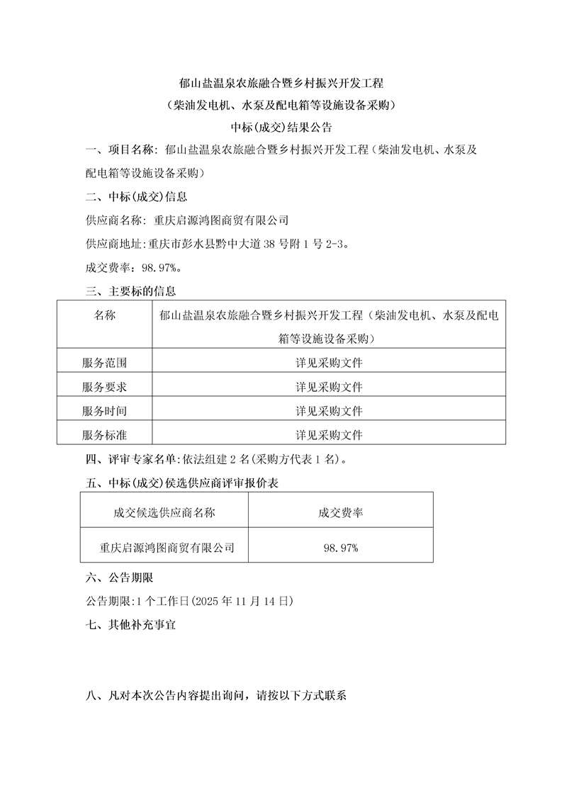 郁山鹽溫泉農(nóng)旅融合暨鄉(xiāng)村振興開發(fā)工程(柴油發(fā)電機(jī)、水泵及配電箱等設(shè)施設(shè)備采購)中標(biāo)(成交)結(jié)果公告