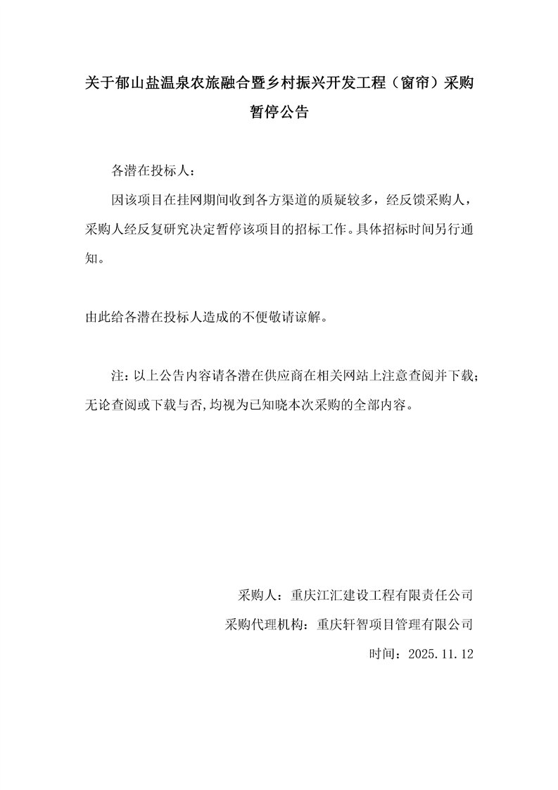 關(guān)于郁山鹽溫泉農(nóng)旅融合暨鄉(xiāng)村振興開(kāi)發(fā)工程(窗簾)采購(gòu)暫停公告